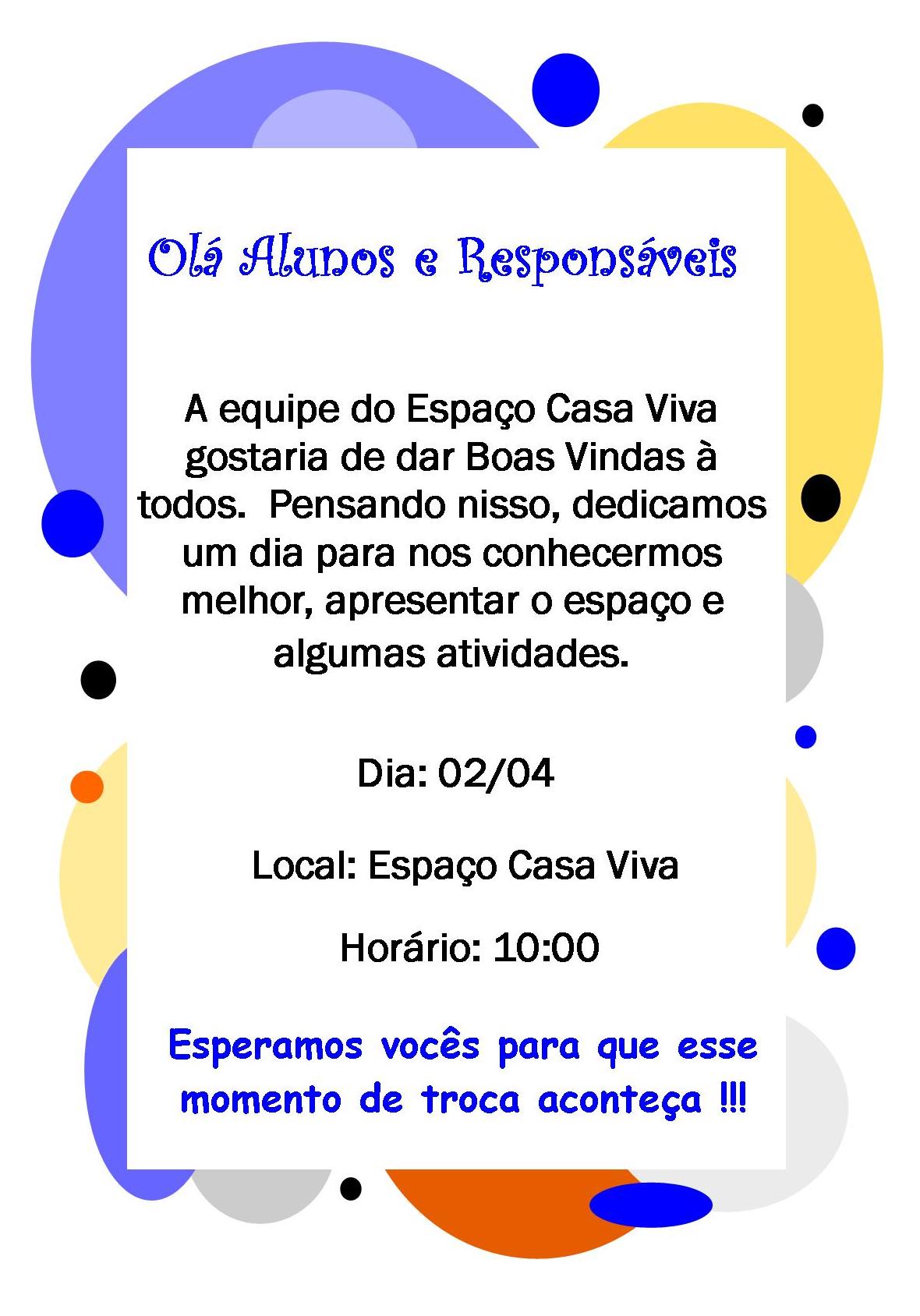 No dia 31 de março, foi realizado no auditório do Espaço Casa Viva, o evento de “Boas vindas” , para todos os responsáveis e alunos, que participam da Escola de Música de Manguinhos e da Oficina Portinari. Tivemos a leitura do poema “Recomeçar – Carlos Drummond de Andrade” ., tivemos a apresentação da equipe e também tivemos uma dinâmica muito interessante. E no final tivemos uma linda mesa de café da manhã pra todos.