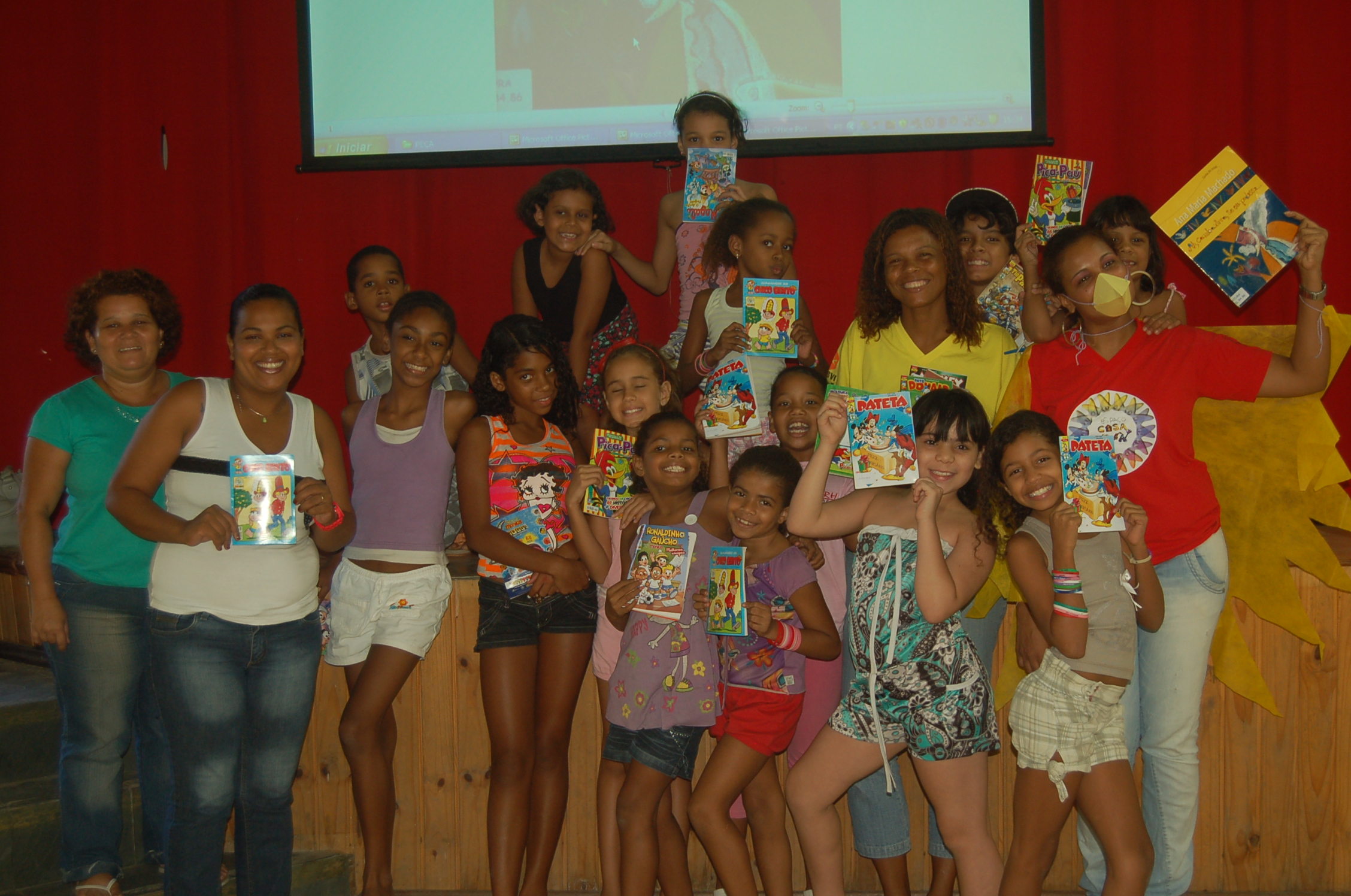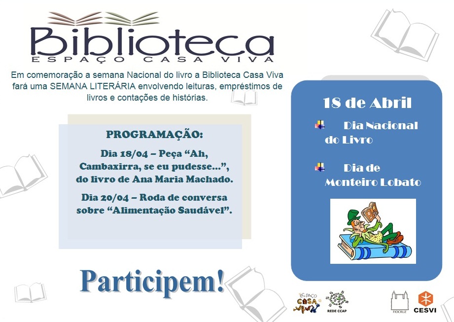 Nos dia 16 a 20 de abril, comemoramos a Semana Nacional do Livro. No dia 18 tivemos contação de histórias e também a peça “Ah Cambaxirra, se eu pudesse…” do livro de Ana Maria Machado e no final todas as crianças e os responsáveis ganharam um gibi de presente.